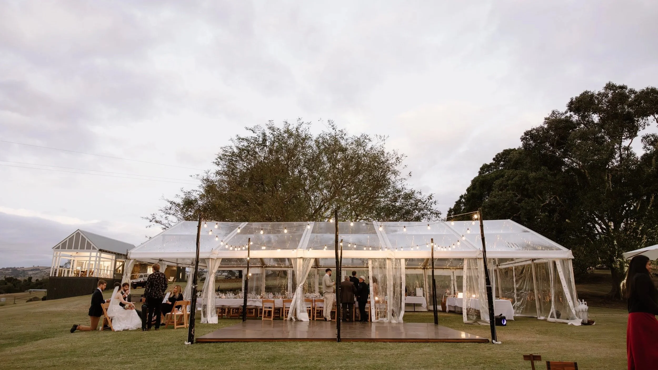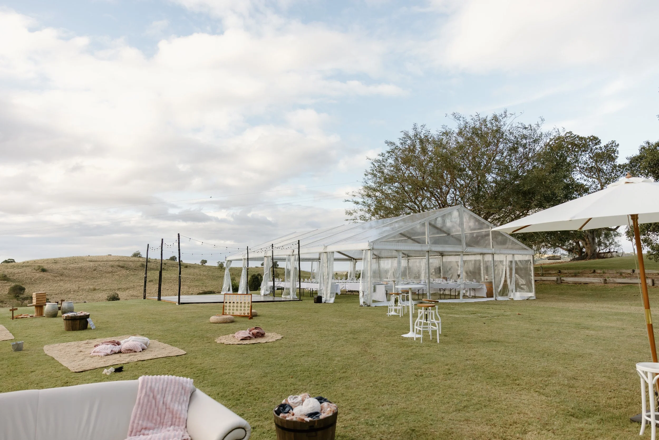 Our 8m × 15m marquee creates a stunning space for dining and celebrating while still enjoying the open countryside views of Fig Tree Hill Estate.